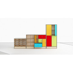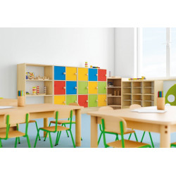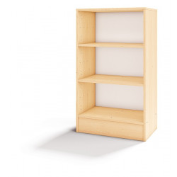 Mobile a giorno con 2 ripiani regolabili, in MDF sp. 4 mm. Struttura realizzata in conglomerato nobilitato ligneo, sp. 18 mm, bordi in ABS, cl. E1, finitura betulla. Funzionale, comodo e sicuro, dà la possibilità di ordinare materiale didattico, oggetti personali dei bambini, zainetti, ecc. Dim. cm. 65x35x113h.