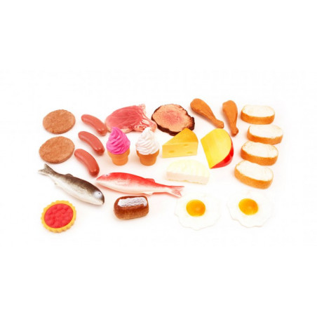 Assortimento alimenti vari tra carne, pesce, pane, frutta ecc.. Età 2 +