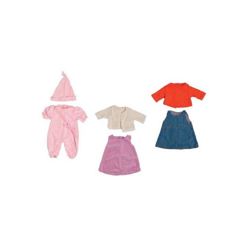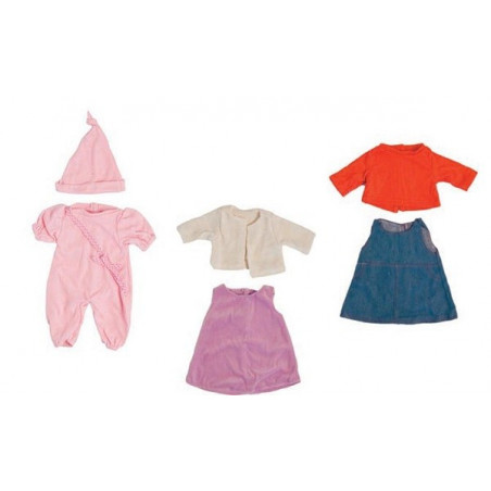 Divertente set di abitini per bambola, costiuito da un pigiamino con cappello e due vestitini.