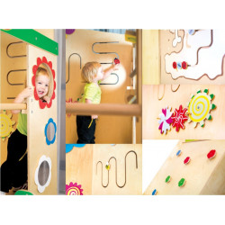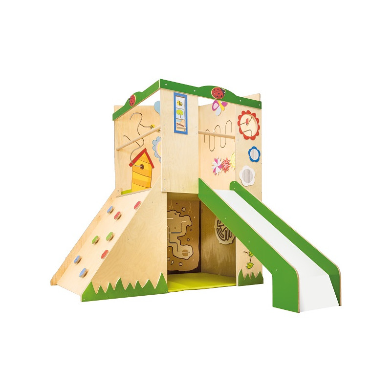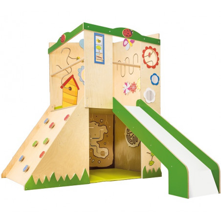 Struttura polifunzionale costituita da un soppalco accessibile da un' arrampicata con uscita a scivolo. Grande spazio sotto sottostante, funge da nascondiglio o casetta. Le pareti di entrambi i piani sono attrezzate con i labirinti, percorsi manipolativi ed elementi sensoriali e decorativi, che rendono questa struttura piacievole e attraente. Realizzata in legno multistrato di betulla e MDF. Tutti gli spigoli sono arrotondati per la maggior sicurezza del bambino. Dimensione complessiva: cm 236x252x199h.