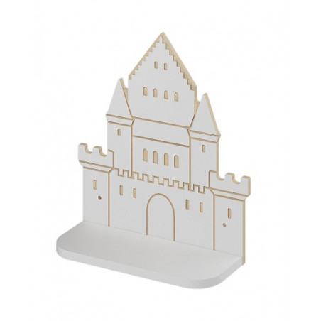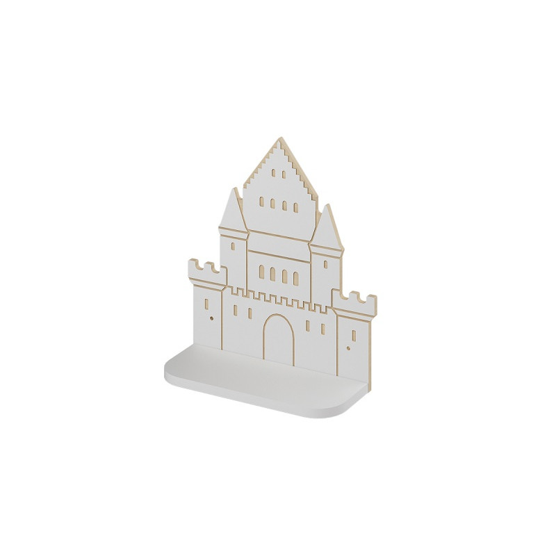 Accessorio a forma di castello, colorato, realizzato in conglomerato nobilitato ligneo con fondo sagomato, spigoli arrotondati e bordi in profilo ABS. La struttura è realizzata in truciolare bianco, spessore 18 mm. L'applicazione è realizzata in MDF bianco, spessore 12 mm. Dim. cm 41,2x16,2.