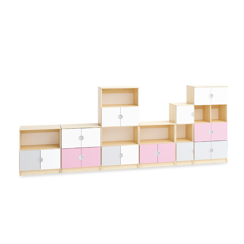 Composizione di 6 moduli con ante in MDF laminato, sp.12 mm. Spigoli e bordi di ante e decori sono arrotondati. Struttura realizzata in conglomerato nobilitato ligneo laminato, sp. 18 mm, classe E1, finitura betulla, con spigoli arrotondati e bordatura in profilo ABS antiurto. Il design moderno, molto pratico e abinamento di colori chiari pastello la rende adatta per ogni ambiente. Ingombro totale cm 419x40x162h.