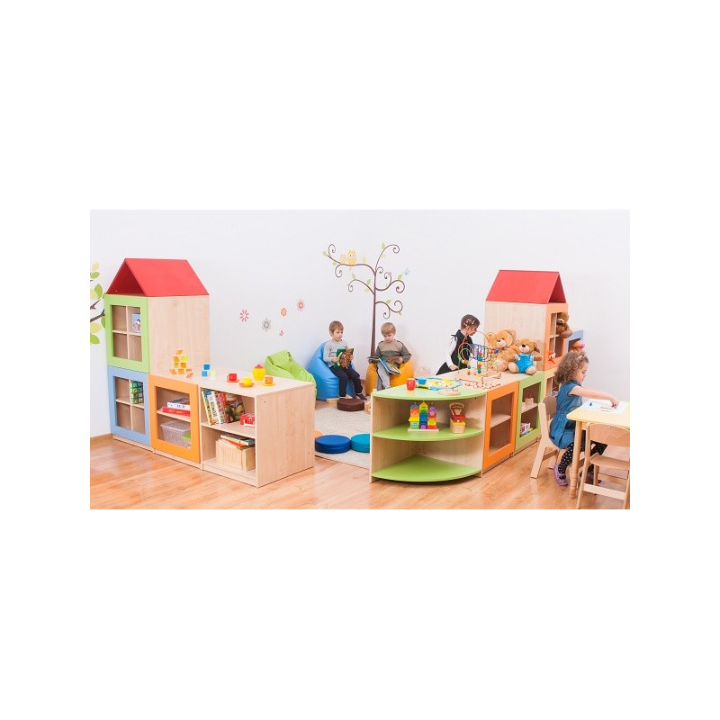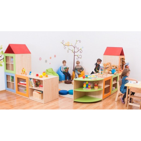 Composta da 6 moduli: A, B, azzurro, giallo, arancio e angolare verde. Realizzata in legno nobilitato finitura betulla, con elementi decorativi colorati, spessore 18 mm con bordi in ABS antinfortunistico. Vari elemeni possono essere accostati a piacere e collegati tra di loro mediante i bulloni, per una maggiore stabilità della composizione.