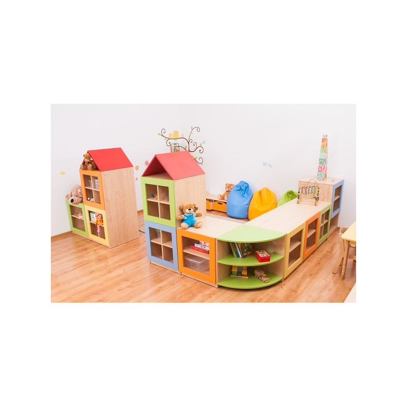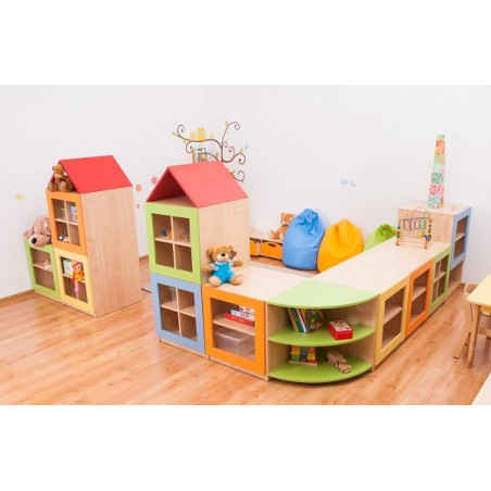 Composta da 7moduli: A, B, azzurro, giallo, arancio, 4 vani verde e angolare verde. Realizzata in legno nobilitato finitura betulla, con elementi decorativi colorati, spessore 18 mm con bordi in ABS antinfortunistico. Vari elemeni possono essere accostati a piacere e collegati tra di loro mediante i bulloni, per una maggiore stabilità della composizione.