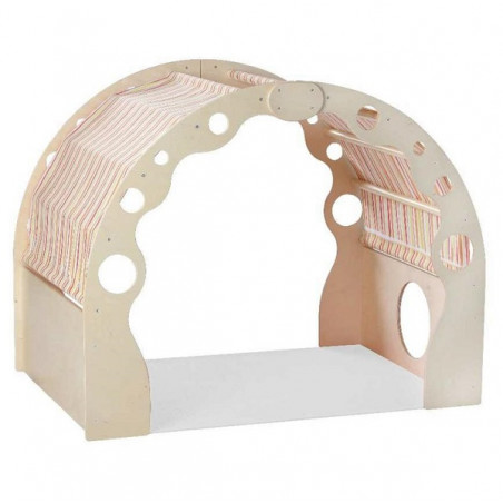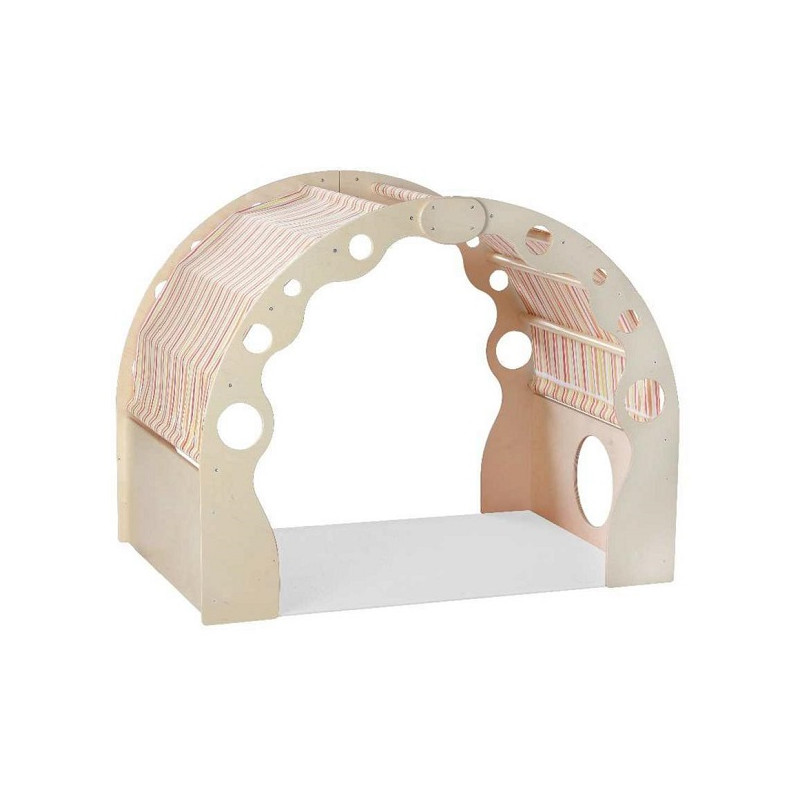 Struttura in pannelli di legno multistrati di betulla sp. mm 12, sagomati e con bordi arrotondati, verniciati al naturale. Aste di collegamento in legno massello a sezione circolare verniciate al naturale. Telo di copertura in tessuto. Assemblaggio mediante viti. Dim. cm 150x100x120h. Conforme alle norme armonizzate UNI EN 71/1-UNI EN 71/2-UNI EN 71/3.