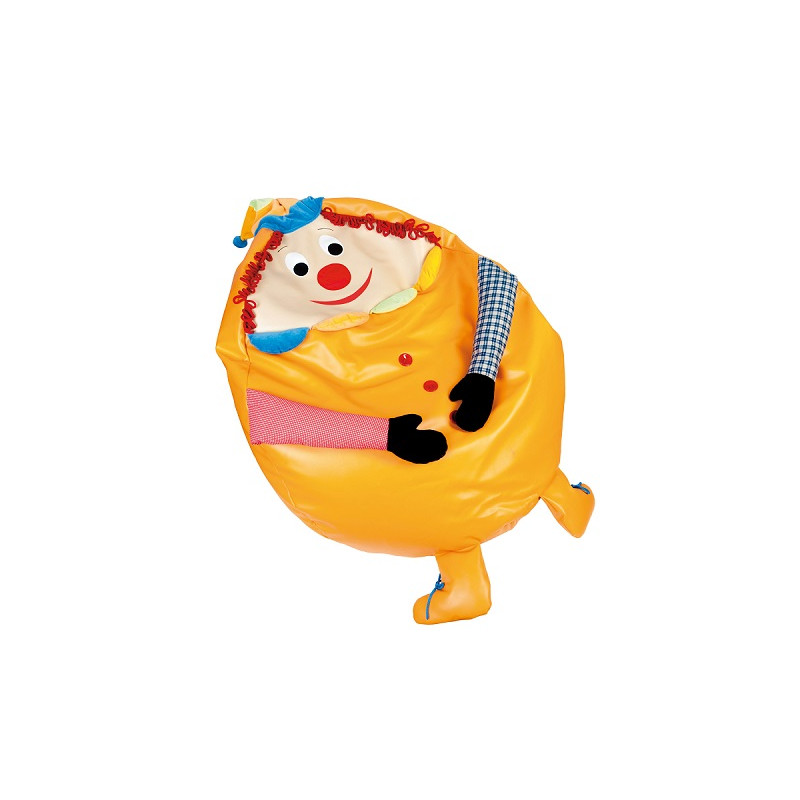 Comoda seduta con elementi sensoriali manipolativi: morbido cappello di veloure, capelli di corda, lunghe braccia con i campanelli per stimolazione acustica, scarpe con i lacci, grandi bottoni e naso con fischietto. Realizzato con rivestimento in similpelle lavabile, idrorepellente, atossico, privo di ftalati e piacevole al tatto. Riempimento con granuli di polistirene si adatta alla forma del corpo. Doppie cuciture con fili elastici e alta qualità di rifiniture garantiscono la resistenza nel tempo anche nell'uso frequente. Dim. cm 60x52x28h. Peso 2,2 kg.