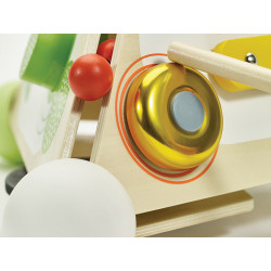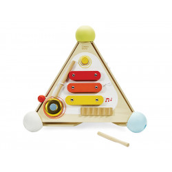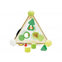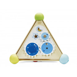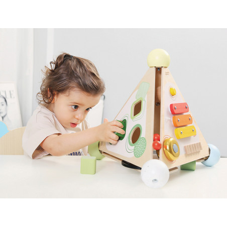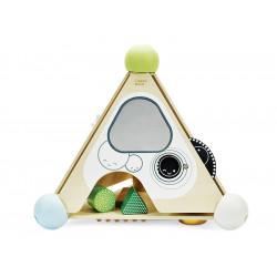 Su ogni lato della piramide ci sono varie attrazioni che coinvolgono gli altri sensi del bambino e ne supportano lo sviluppo nelle prime fasi della vita. Dotata di ingranaggi, strumenti musicali (xilofono a bacchette, grattugia Guiro, campanello, pulsante sonoro), selezionatrice, specchietto con ruota emozionale. Grandi manopole su tutti i vertici consentono un facile posizionamento del prodotto e una manipolazione sicura. Età: 2+