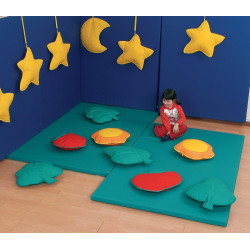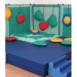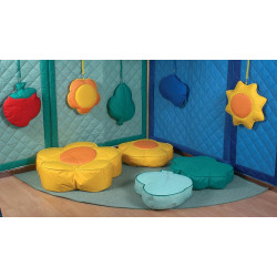 Rivestimento esterno in tessuto ignifugo di classe 1, atossico, privo di PVC, antimacchia. Imbottitura in microgranuli di polistirene ignifughi di classe 1, atossici, racchiusi in una fodera di helanca dotata di cerniera. Dotato di nastrino e moschettone per poter essere appesi. La cerniera sul retro permette di trasformarli in simpatici contenitori. I cuscinetti possono essere lavati in acqua con comune detersivo alla temperatura consigliata di 30°C. Dim. ø cm. 58.