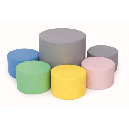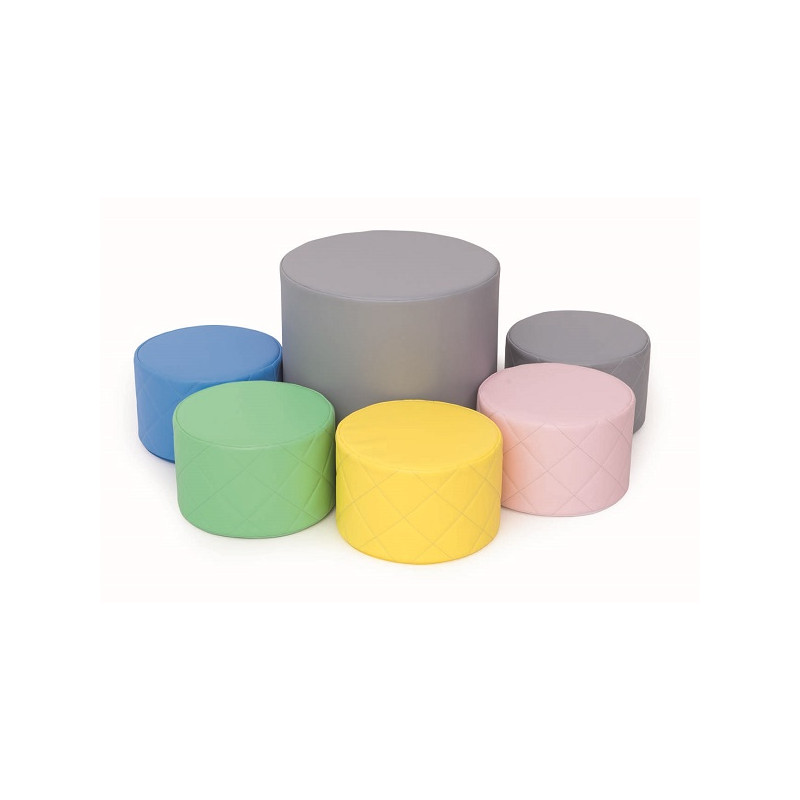 Set composto da 5 pouf trapuntati e un tavolo morbido. Realizzati in morbido poliuretano espanso di alta densità e rivestiti con similpelle lavabile e piacevole al tatto. Sono estremamente confortevoli e resistenti alle deformazioni e schiacciamento, ciò li rende ideali per gli angoli gioco, lettura e socializzazione. I delicati colori pastello sono piacevoli da guardare e si adattano a qualsiasi ambiente interno. Diam. tavolo cm 45x40h, diam. pouf cm 30x20h.