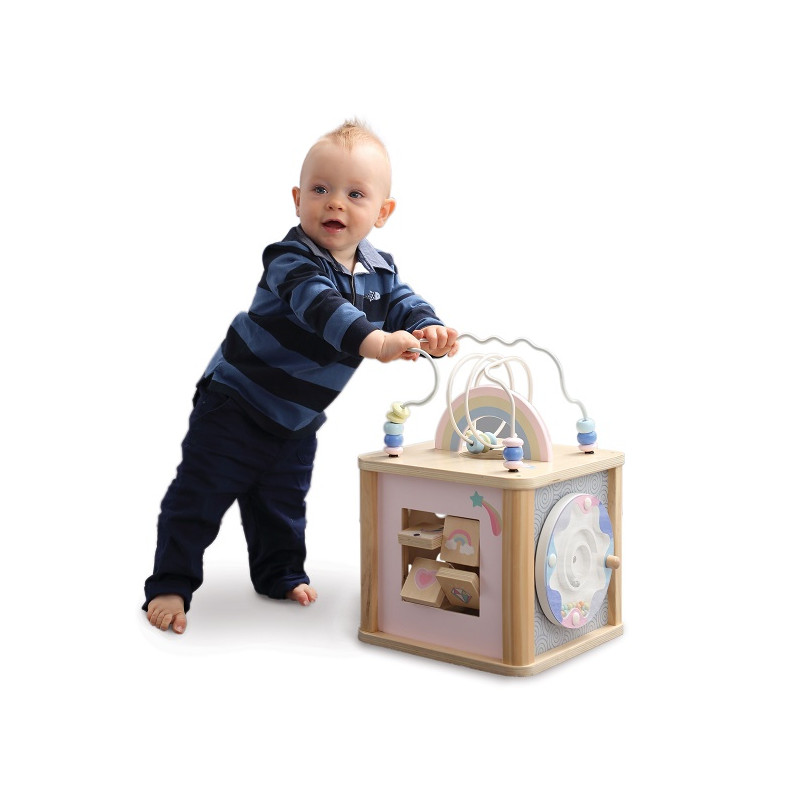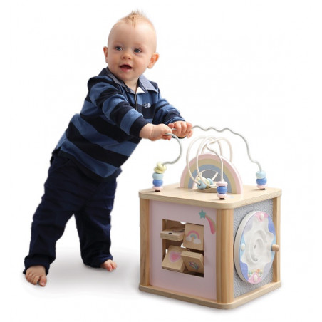 Ogni parete presenta una diversa sfida per il bambino. Il giocattolo insegna pensiero logico, pazienza e aiuta a distinguere forme e colori. Attività presenti: labirinto con perline, 4 elementi puzzle girevole con un unicorno, smistatore di forme, percorso zig-zag, labirinto manipolativo. Dim cm 28x26,5x42h, età: 18 mesi +