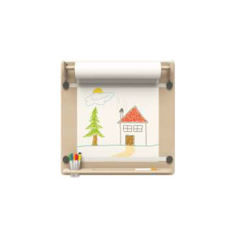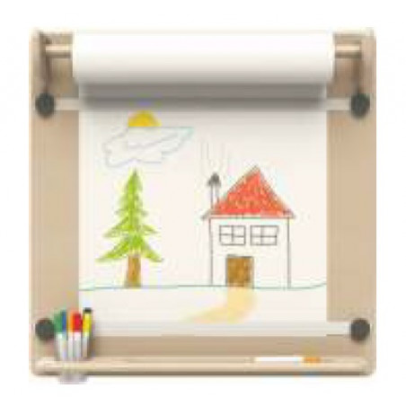 Interamente realizzata in legno multistrato di betulla lucidato al naturale con vernici atossiche con bordature perimetrali a profilo e spigoli arrotondati. Dotato di carta in rotolo da cm. 60, di lame ferma foglio con volantini e mensola con foro porta bicchieri e vano porta pennarelli. Dim. Cm. 70x70h (1 rotolo incluso)