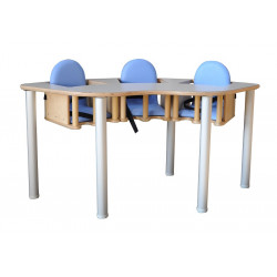 Un innovativo tavolo con all'interno tre seggioloni, in unica postazioni si possono tranquillamente gestire più bambini. Un progresso per il classico tavolo pappa. Seggioloni rivestiti in skay disponibili in tutti i colori del campionario. Piano in multistrato di betulla da mm.24 di spessore con rivestimento in laminato plastico ad alta pressione da mm.0.9 con bilanciatura. Finitura antigraffio e antiriflesso. Gambe in alluminio a sezione circolare di diam. 60 mm, ancorate al piano tramite piastre in nylon. Il tavolo pappa proposto è un tutt’uno con i seggioloni, grazie ad una soluzione innovativa in cui i bambini si siedono dentro il tavolo e non attorno ad esso. Grazie a delle speciali forme passanti i seggioloni sono inseriti nel piano e restano bloccati tramite una sede in multistrato di betulla.