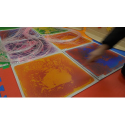 Set di 4 pannelli di dim. 50x50 cm, contenenti le sostanze oleose liquide di diversi colori. Toccando la supeficie dei pannelli con i mani o piedi, i liquidi cambiano le forme, si spostano e mischiano tra di loro, fornendo un interessante esperienza visiva e creativa.