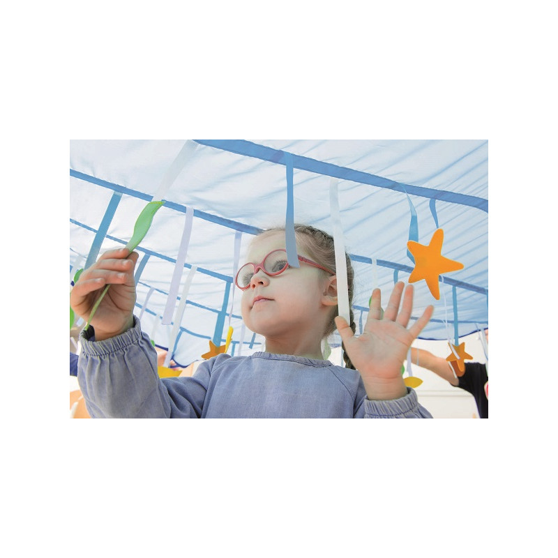 Il paracadute con 8 manici è una risorsa innovativa che sostiene lo sviluppo sensoriale i bambini. Molti elementi pendenti colorati e in varie forme stimolano i sensi dei bambini e li invitano a scoprire e giocare. Diam. 250 cm.
