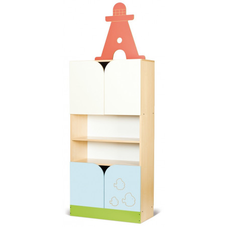 Struttura in conglomerato nobilitato ligneo, sp. 18 mm. cl. E1, finitura betulla. Spigoli arrotondati e bordi in profilo ABS antiurto. Ante e decoro in MDF laminato, sp. 12 mm, sagomate e pantografate. Schienale rifinito con MDF laminato bianco, sp. 4 mm e avvitato alla struttura. Spigoli arrotondati. Disponibile anche con i piedini.