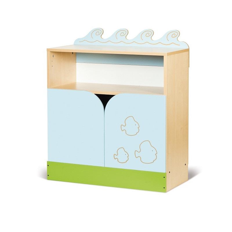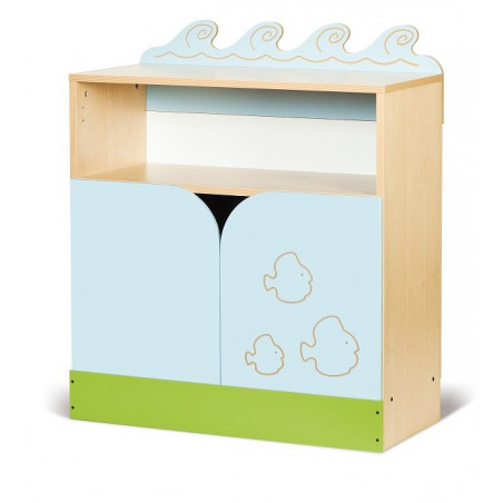 Struttura in conglomerato nobilitato ligneo, sp. 18 mm. cl. E1, finitura betulla. Spigoli arrotondati e bordi in profilo ABS antiurto. Ante e decoro in MDF laminato, sp. 12 mm, sagomate e pantografate. Schienale rifinito con MDF laminato bianco, sp. 4 mm e avvitato alla struttura. Spigoli arrotondati. Disponibile anche con i piedini.