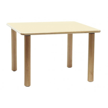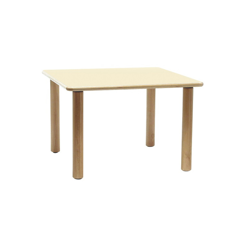 Piano in multistrato di betulla di sp. 24 mm, placcato con laminato plastico di sp. 0,9 mm in finitura opaca, antiriflesso, lavabile e antigraffio. Bordi ed angoli arrotondati, lucidati al naturale. Gambe cilindriche in legno massello di faggio, diam 60 mm, con gommini antisdrucciolo e antiestrazione. Colori disponibili: magnolia, blu, azzurro pastello, giallo, giallo pastello, rosso, arancio pastello, verde e verde pastello. Dim. cm 65x65x64h.