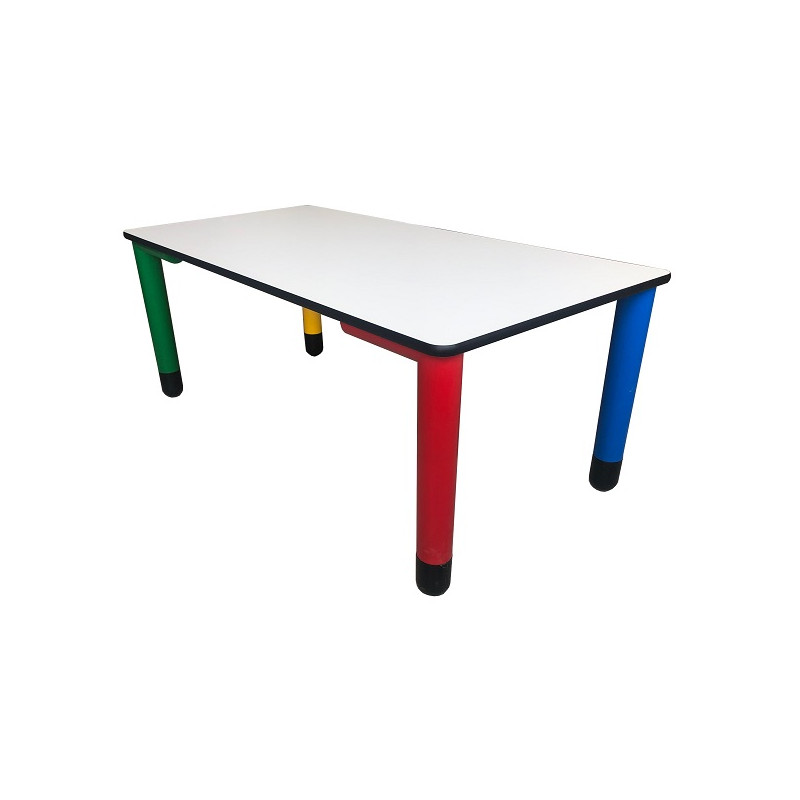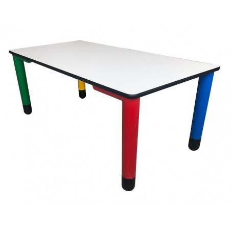 Struttura realizzata in polipropilene colorato di diam. 60 mm, ad alta resistenza agli urti e completamente privo di spigoli pericolosi. Piano in legno agglomerato idrofugo nobilitato di colore bianco ecologico con finitura antigraffio e antiriflesso. Bordatura perimetrale in ESAFLEX (nero o colorato in base alla disponibilità) morbido anti trauma, a profilo bombato e spigoli arrotondati. Sono disponibili in quattro colori: Rosso, Verde, Giallo e Blu. Dim. cm 120x65x53h.